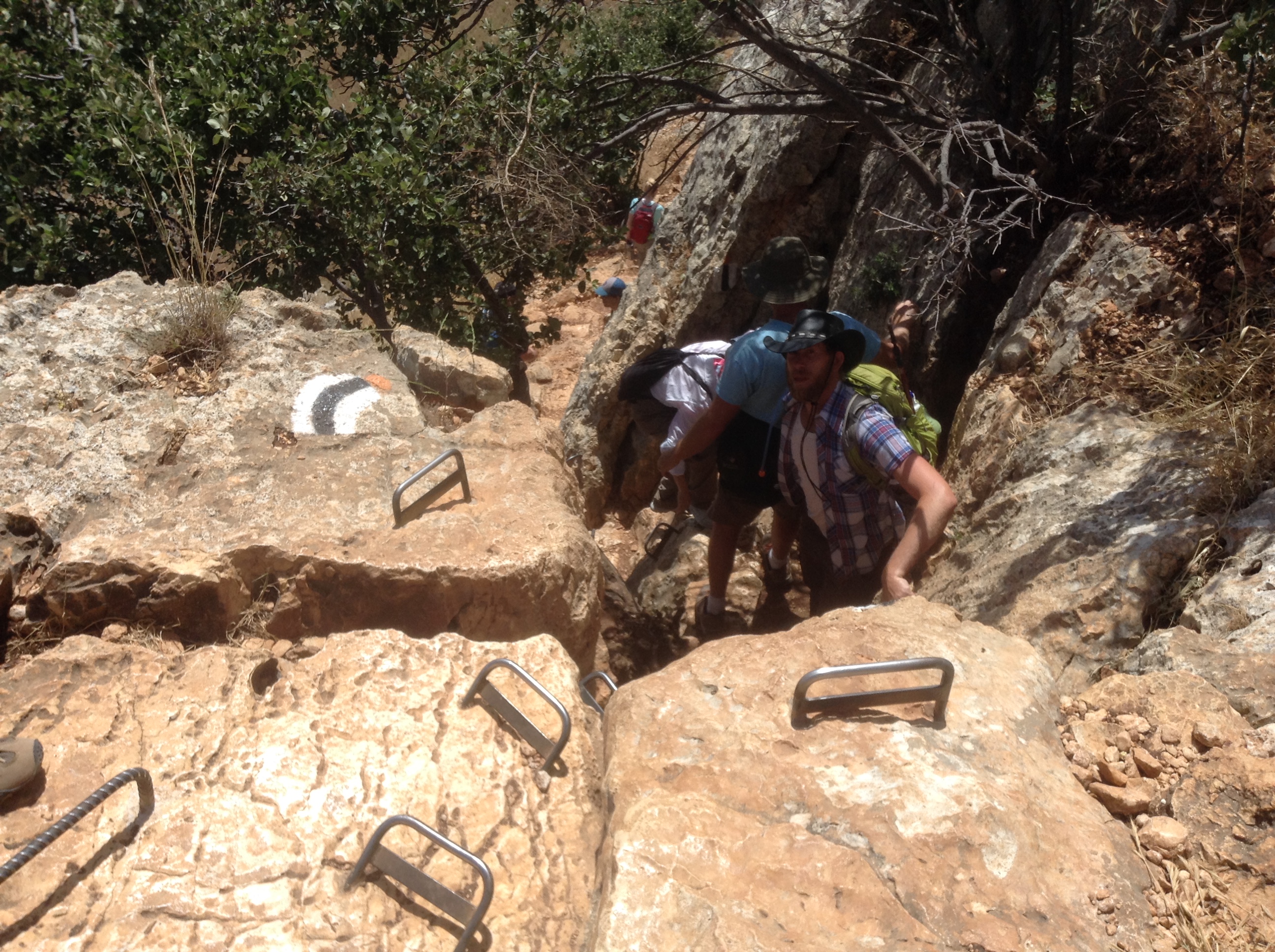 You can see from the photo that I am not exaggerating. We were told that morning before we left that there were some “rocky bits” and “one strenuous part.” We had been on rocky bits the whole trail. I should have know that when James said “strenuous” it really would be. There were large iron staples embedded in the rock face to hold on to and step on as one climbed down.
