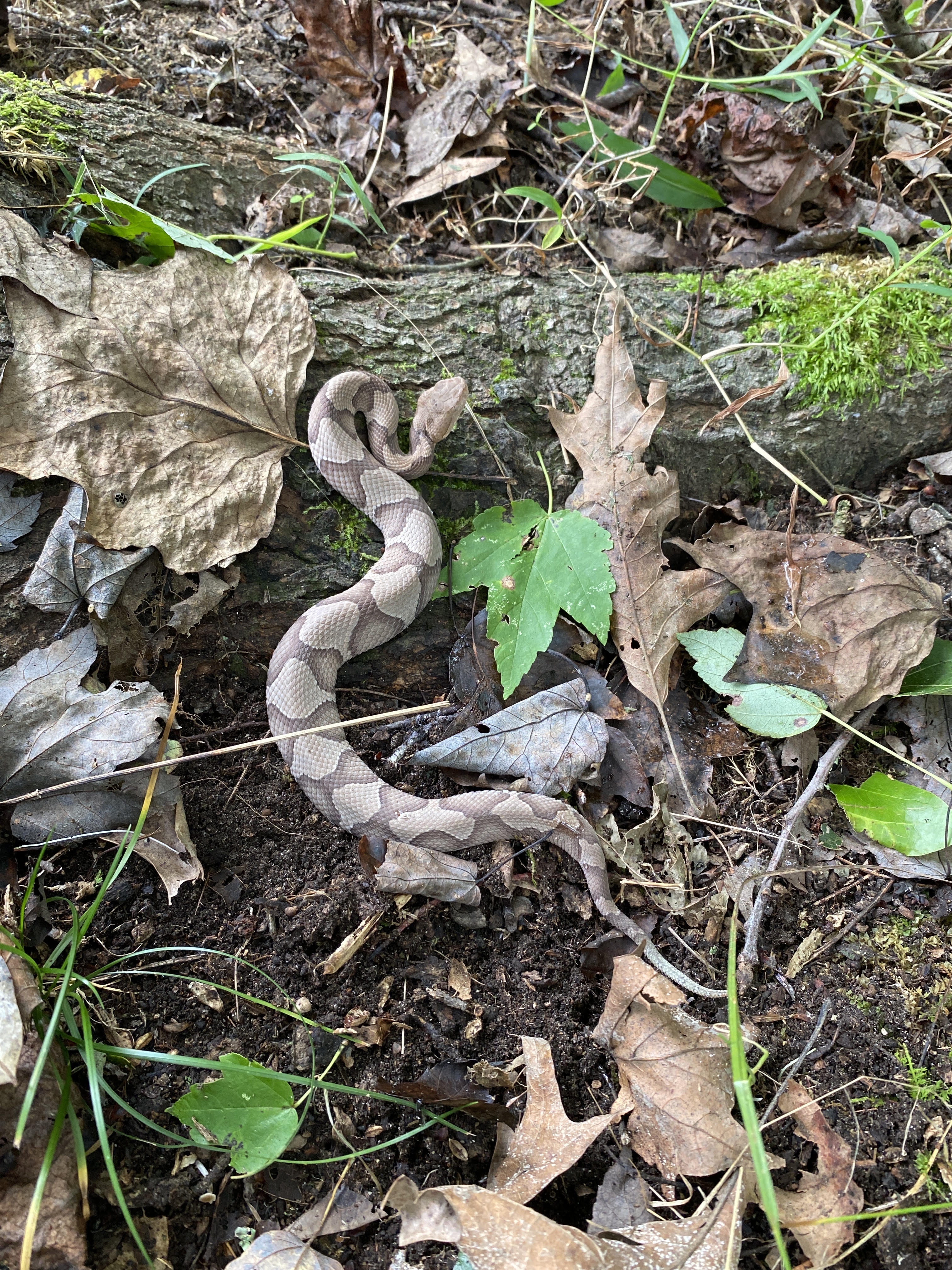 I was weeding at our daughter’s home in Maryland last week and something moved just where I had pulled up a bunch of weeds. I looked closer and it was a small snake – the one pictured above. It was only about 8 inches long but I soon realized it was a copperhead because of the pattern and the shape of the head. I am not generally afraid of snakes, yet when I recognized that it was a poisonous snake my first reaction was thankfulness that I had not grabbed it.
